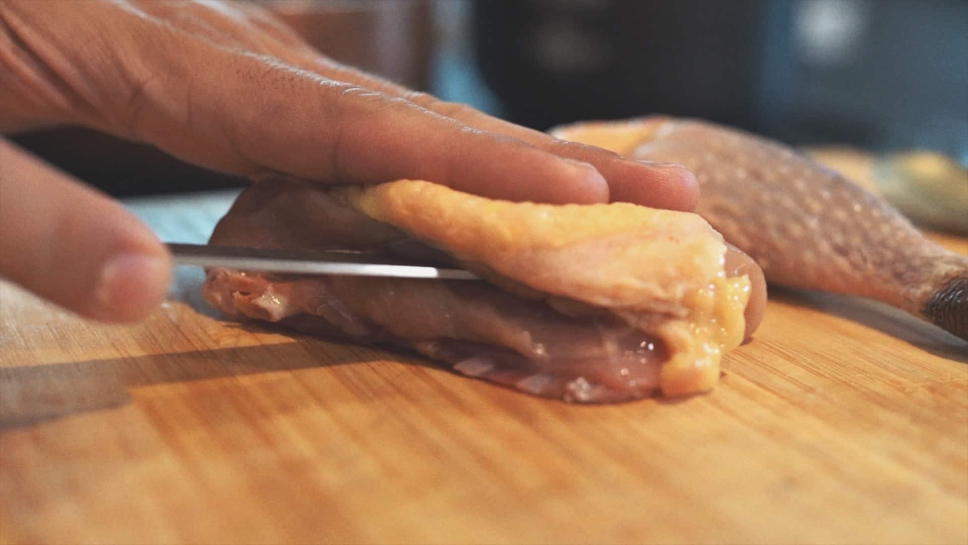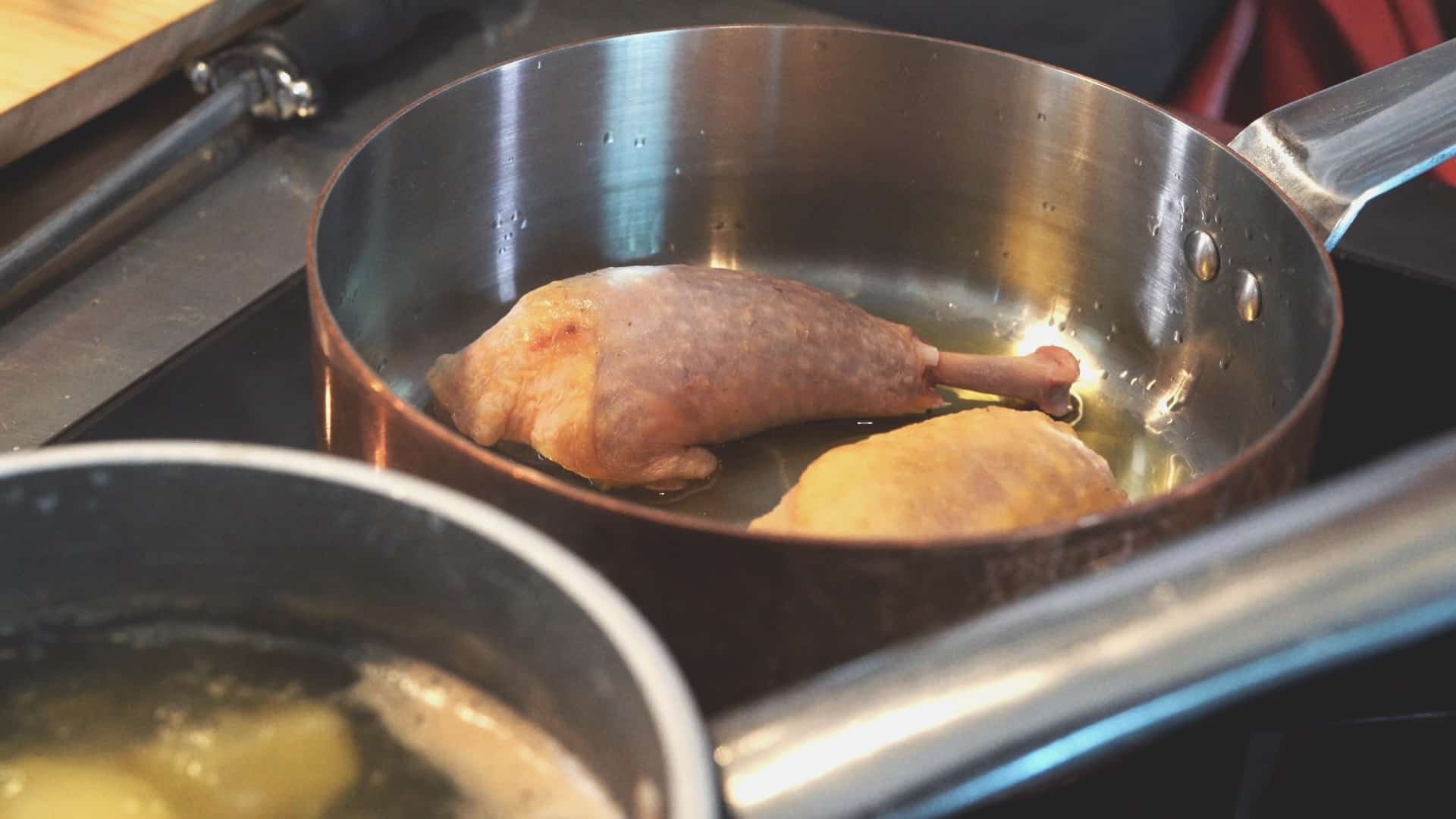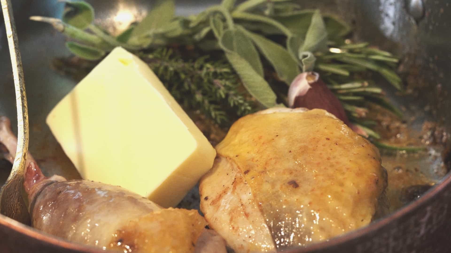Open a “pocket” on guinea-fowl’s chest and thigh with a sharp, pointed knife [1]. Stuff the two pieces of guinea-fowl with White Truffle Sauce [2]. Cook the guinea-fowl in a saucepan with EVO oil [3] and after browning the meat a little, so as to seal it by preventing the filling from leaks, add the odors and butter [4].