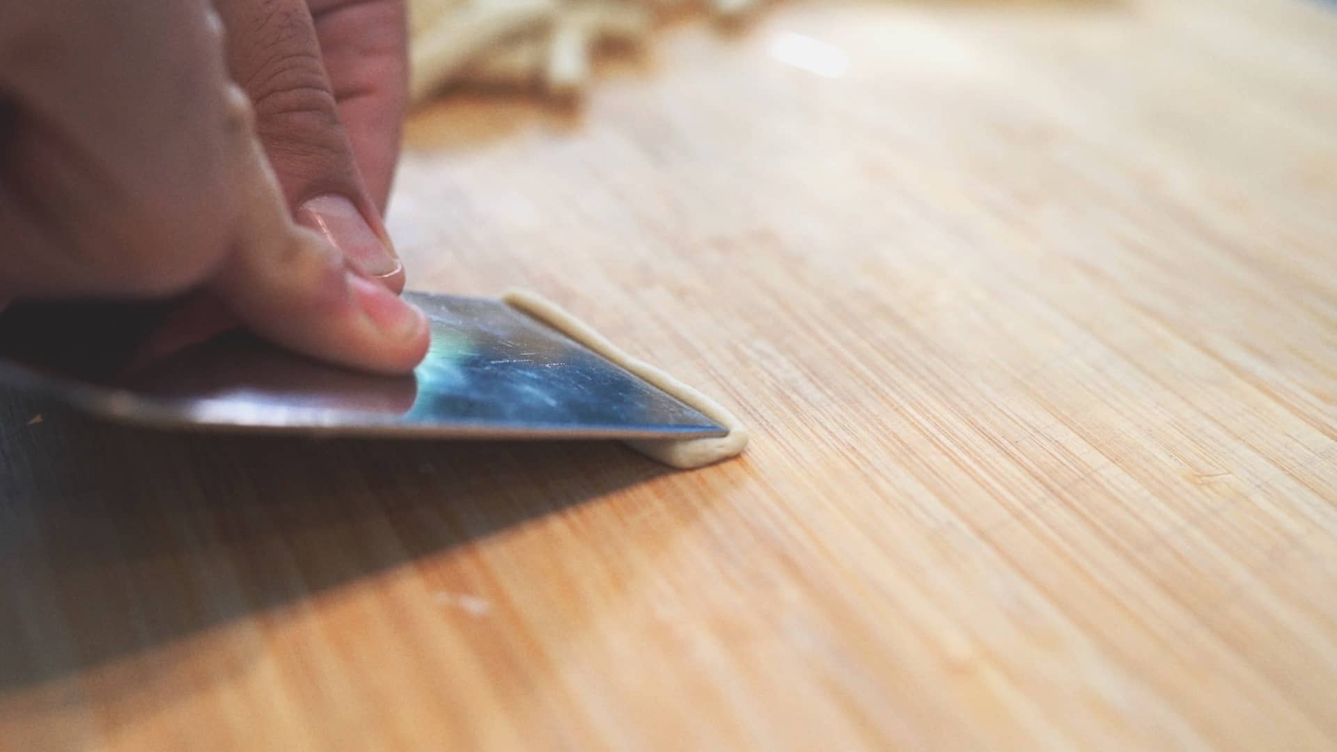 When the dough has compacted, cut slices and roll them out as if to form Vermicelli [2] which we will cut about 5 cm long [3]. At this point we will give life to the Strascinati pasta, dragging, precisely, the dough with the tip of a kitchen spatula [4].