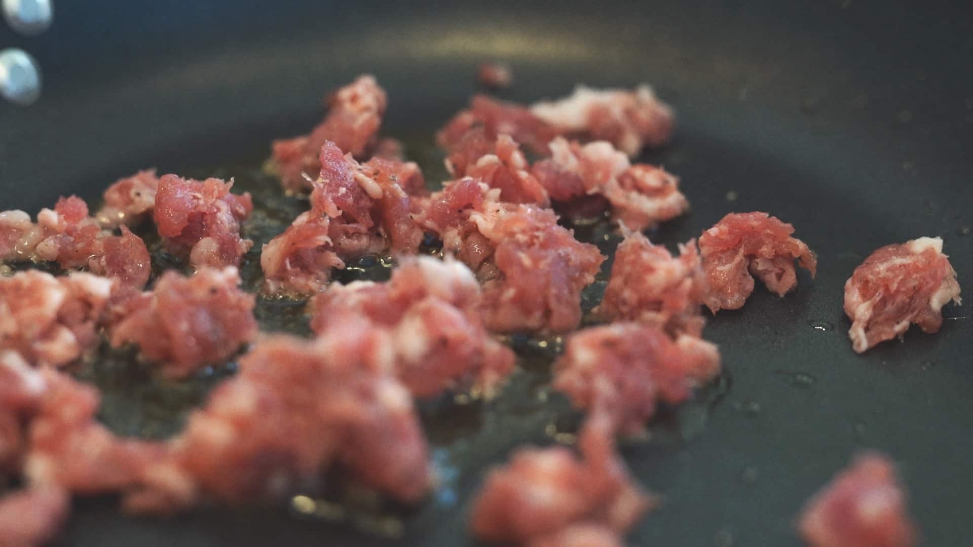 Meanwhile, fry the hand-broken sausages in a pan with a little oil. As soon as the drains are cooked, drain them directly in the pan and sauté them [6].