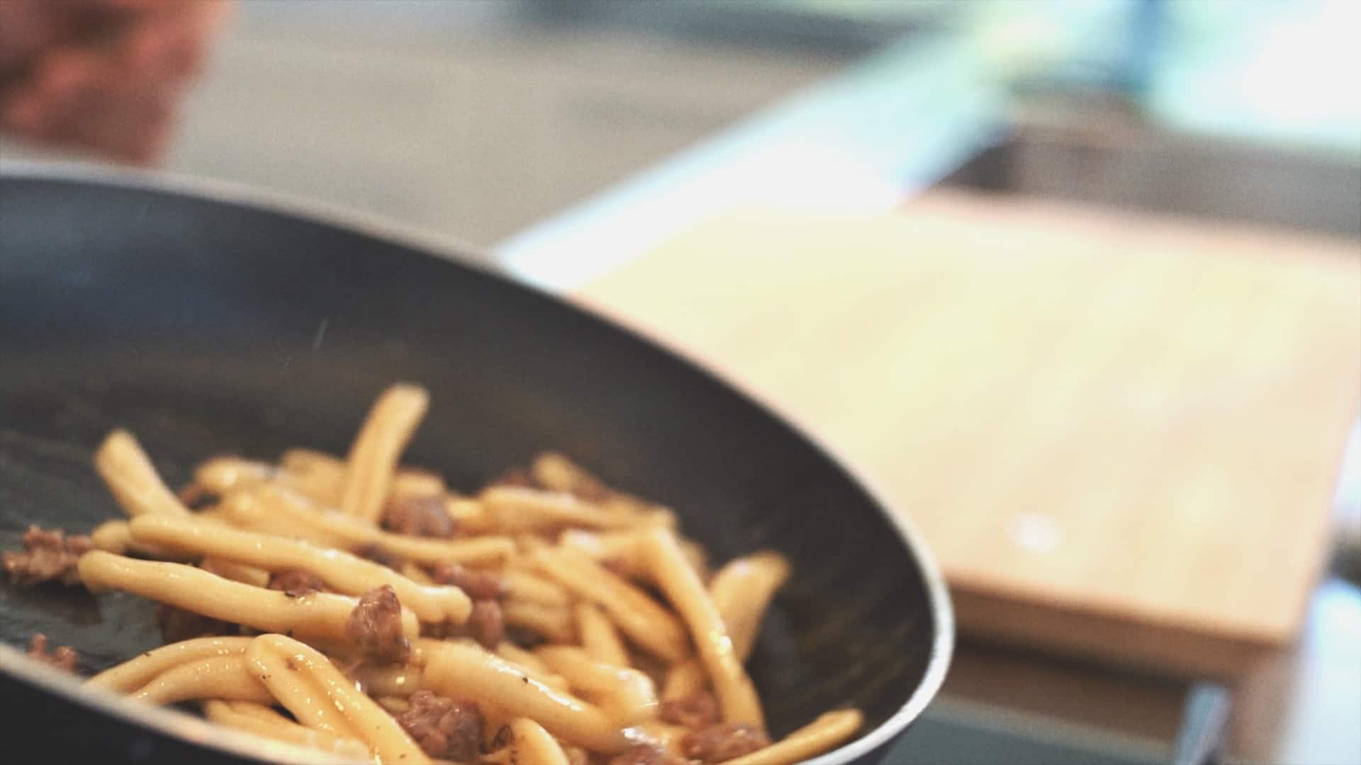 For the pasta, mix 4 tablespoons of flour, type “0” and 2 tablespoons of flour of type “2” incorporating warm water [1]. Work first in a bowl and then by hand, on a wooden chopping board. As soon as the mixture has reached the desired consistency, let it rest in the fridge for about 30 minutes.