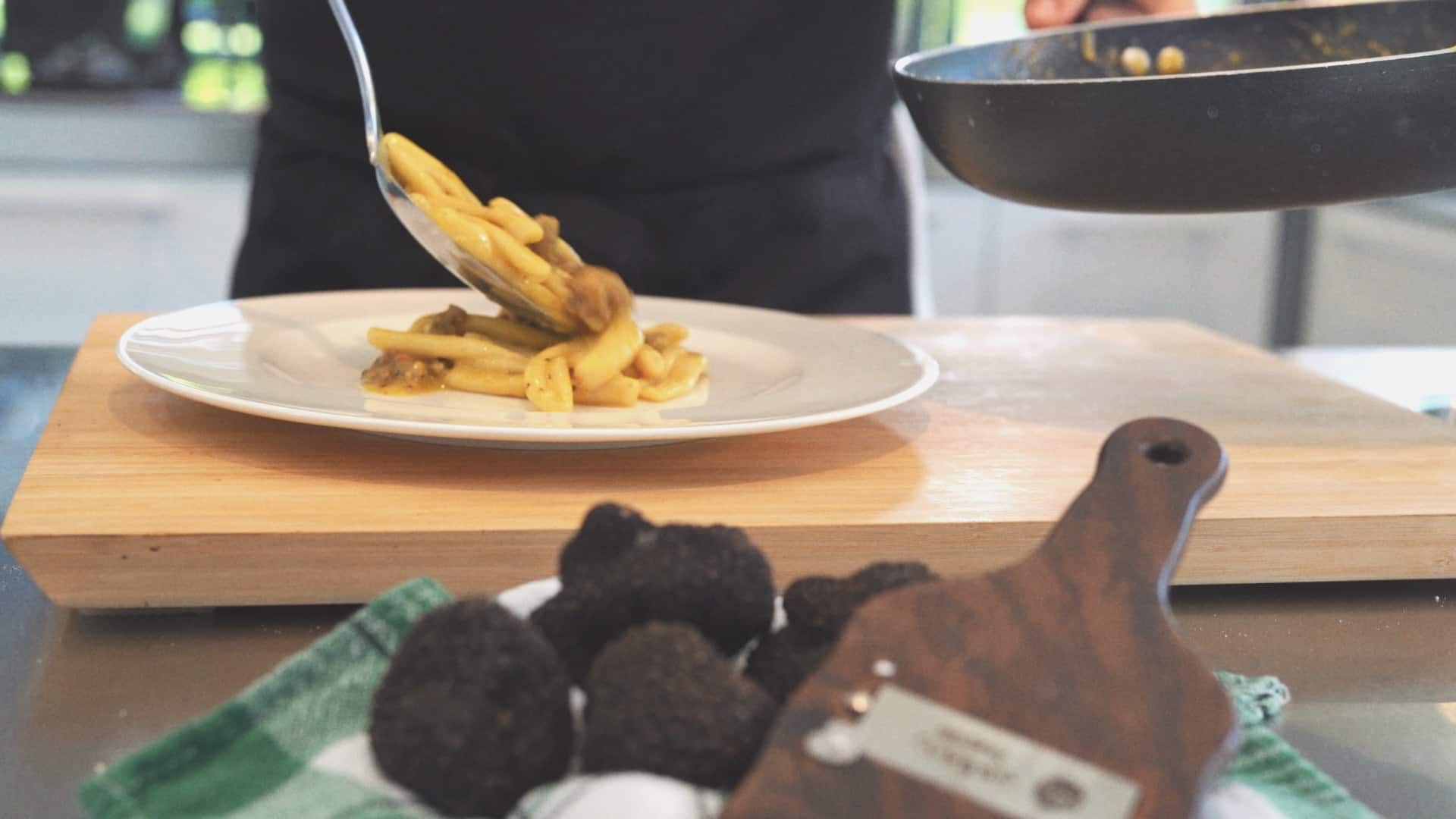 With the Truffle Academy chefs we have prepared a simple but tasty recipe, perfect to enhance the amazing flavor of fresh truffle. The sausage, cooked with must and black truffle are a first dish of the holidays, something precious to share with someone important. A very tasty dish that goes well with the Summer Black Truffle but that is enhanced with some fine black truffle slats.