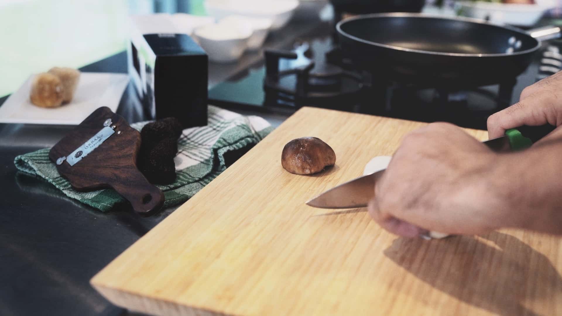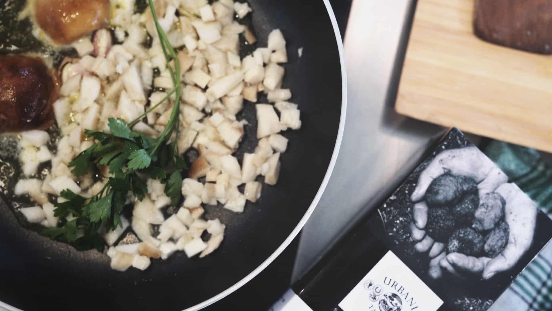 Cut Urbani Porcini mushrooms in dice [1]. Cook them in a pan with extra virgin olive oil and garlic [2], adding parsley, salt and pepper.