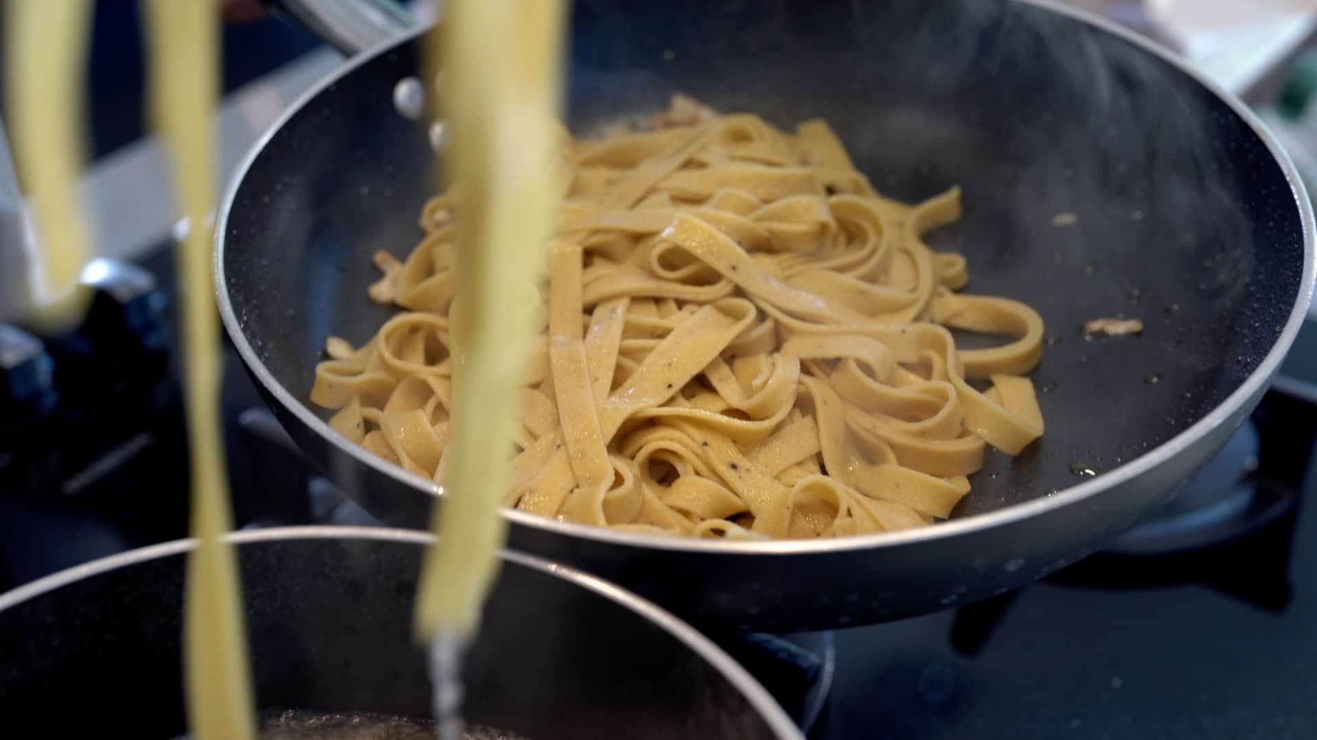 Melt two tablespoons of cooking cream and a tablespoon of fresh robiola in a bain-marie, also adding a few drops of lemon to give a touch of acidity [3]. Meanwhile, drain the pasta in salted water and, after 5 minutes [4], drain the tagliatelle directly into the pan with the mushrooms [5]. Also leave some cooking water, which we will need to tie the dish. Add, to taste, a staple of nutmeg.