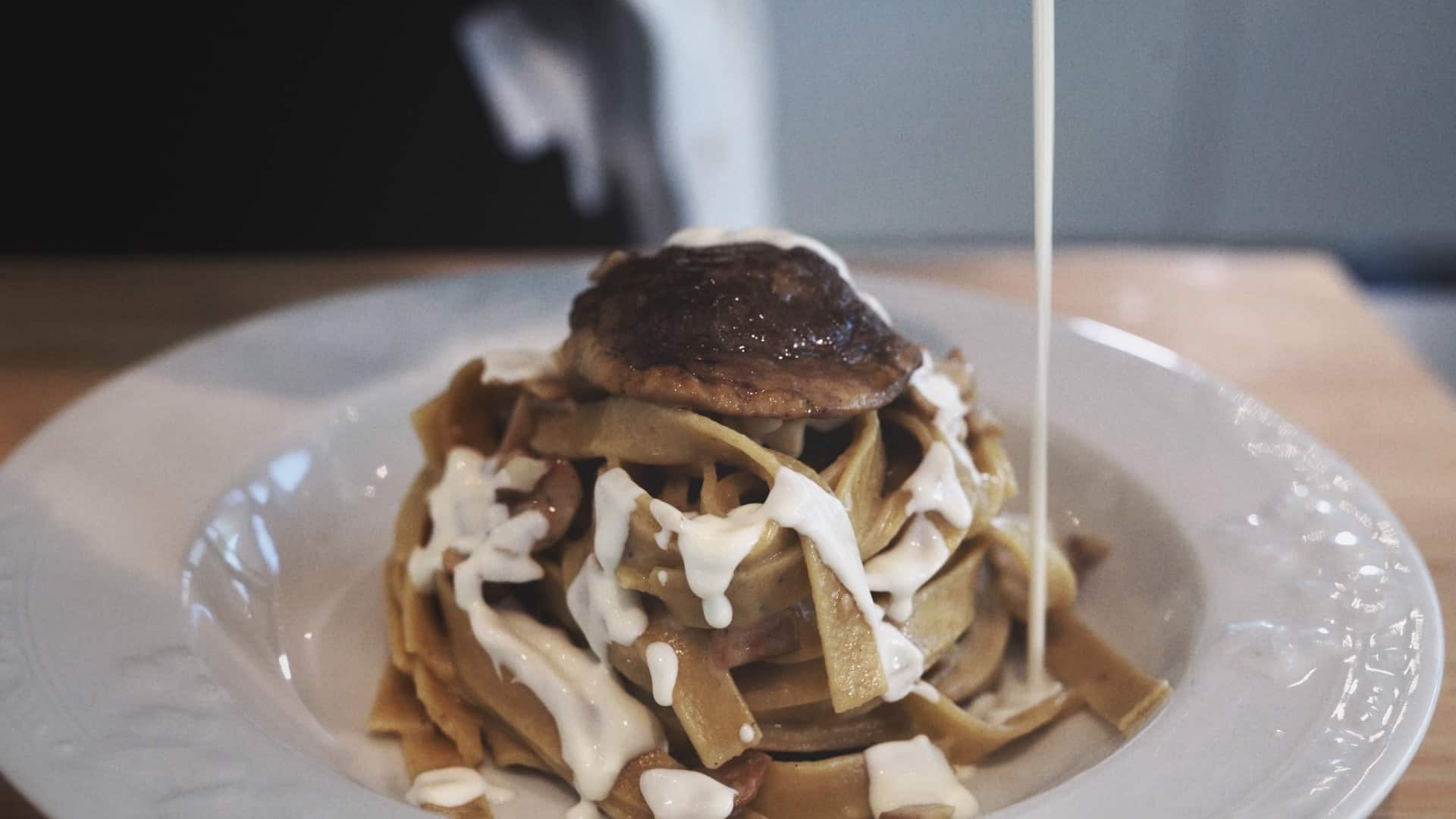 To stack, help yourself with a ladle so as to create a tagliatelle nest [7]. Garnish with a chapel of porcino mushroom [8], the remaining robiola sauce and fresh parsley [9].