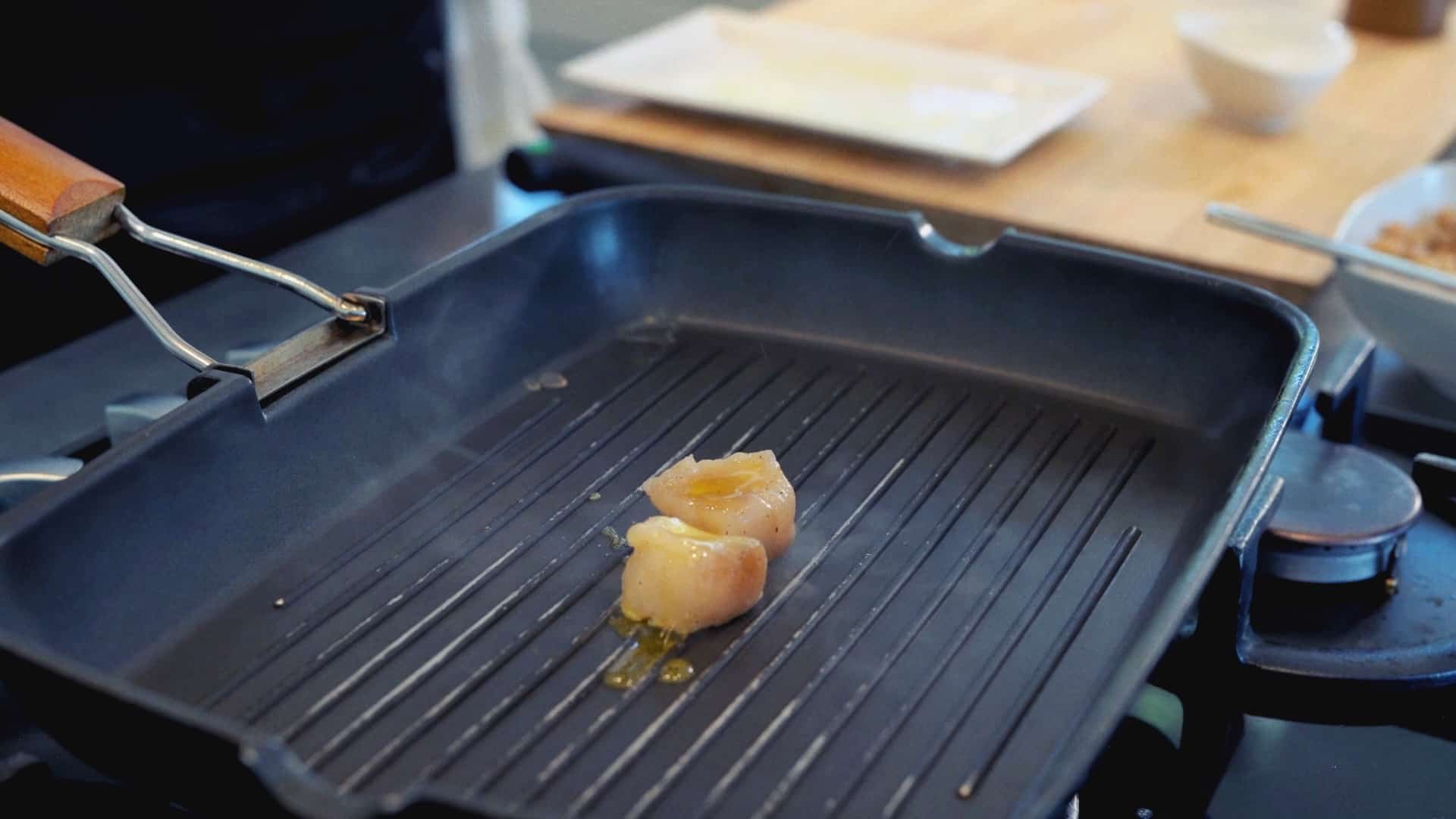 Sear the scallops, previously seasoned with oil, salt and pepper, in a red-hot plate (about 3 minutes per side) [5].