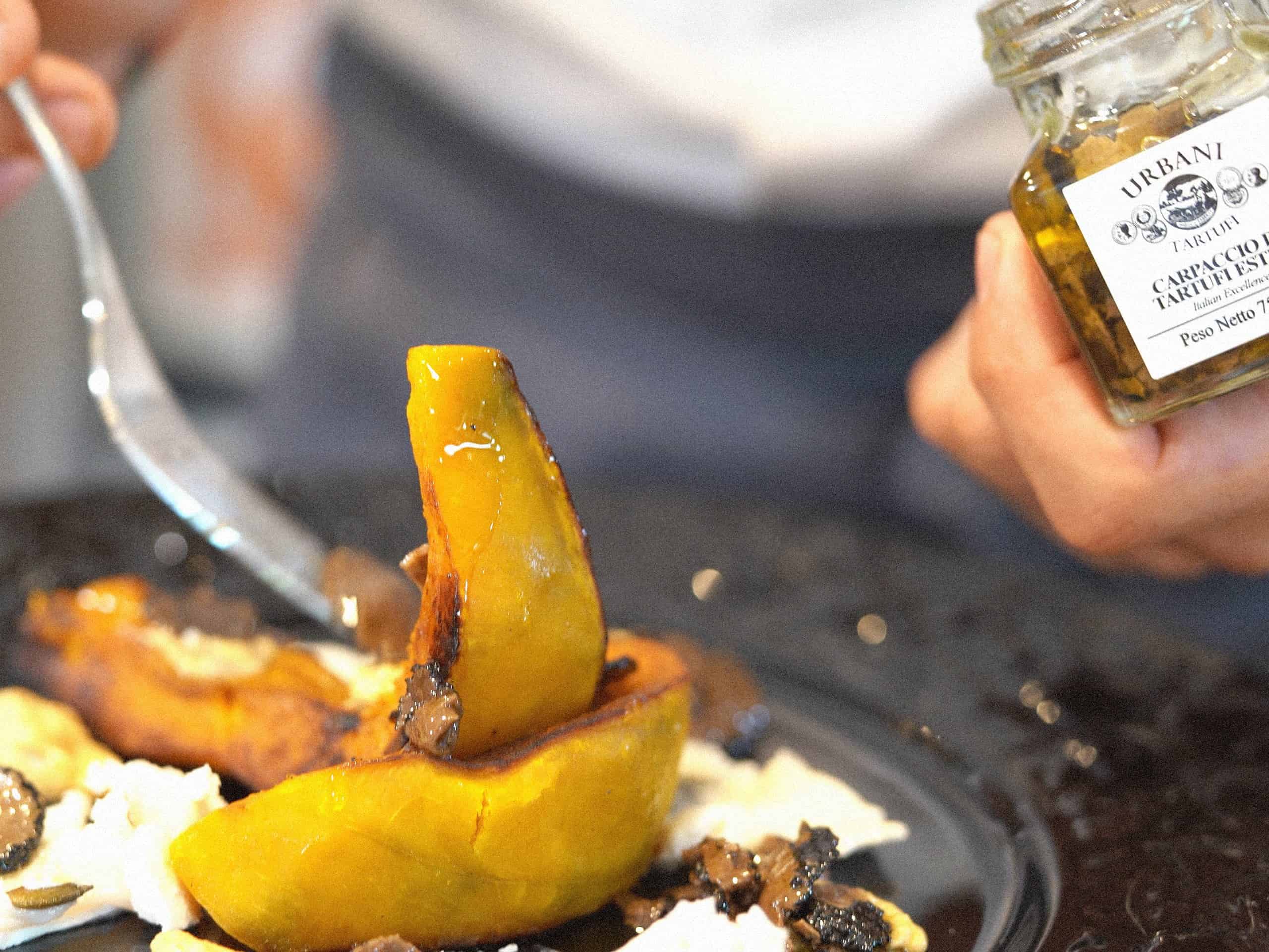 La zucca è uno straordinario ortaggio troppo spesso non valorizzato a sufficienza. L’accostamento con la mostarda è un classico, e in questa ricetta viene riproposto grazie all’utilizzo della Mostarda al Tartufo. Il piatto, un secondo vegetariano, viene impreziosito da alcune lamelle di Carpaccio di Tartufi Estivi.